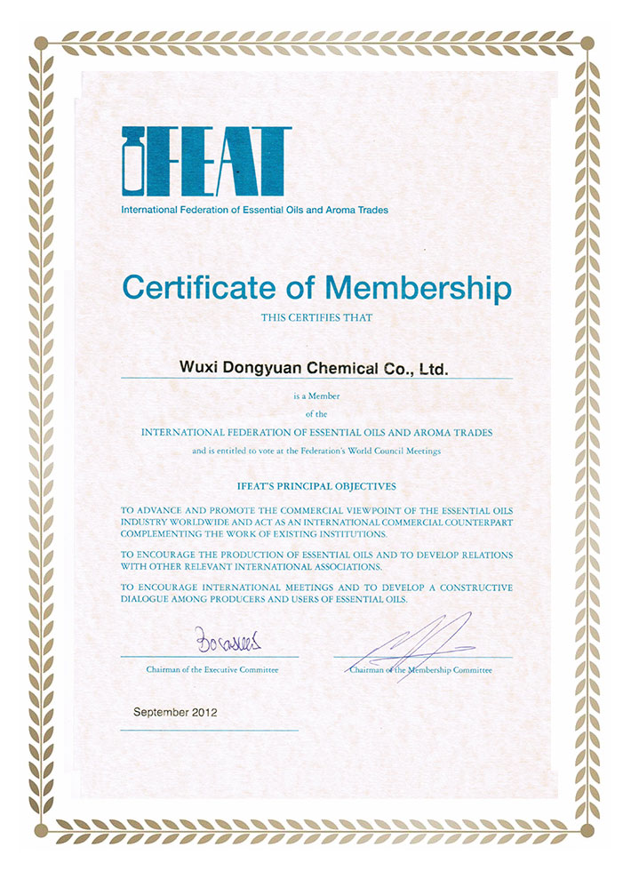 QualityWuxi Dongyuan chemical industry co.,ltd, whose products are mainly made of natural raw materials, safe, green and pollution-free, has become amember of the international federation of essential oils and aroma trades and is entitled to vote at the federation's world council meetings.